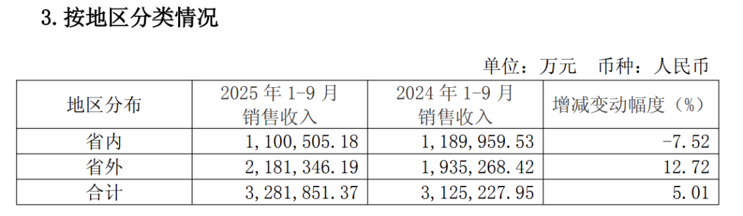 从区域市场来看,前三季度,汾酒省外市场销售收入 218.13亿元,同比增长12.72%;省内市场销售收入110.05亿元,同比下滑7.52%。