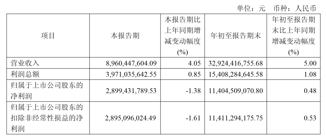 其中,第三季度营收89.6亿元,同比增长4.05%;归母净利润为28.99亿元,同比下滑1.38%。